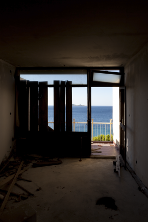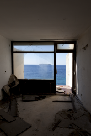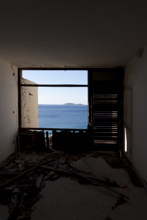 What remains are the complicated dynamics of identity and relation, of space and time. Inspired by these impressions, both artists built their own virtual hotel composed from the rooms of several ruins. The viewer / auditor is taken through this fictive hotel as a tourist, becoming part of a vacant imaginative place that tells its very own story by means of visual and audible images. The sound of gigantic concrete structures, of the nearby sea, the presence of several, quite small appearing individuals develops an independent existence and give an idea of the former activity. The photographs depict the places where the sound-recordings took place. They are linked chronologically to the composition and by showing the same localities serially they also point out to the functionality of these resorts as places for mass tourism.